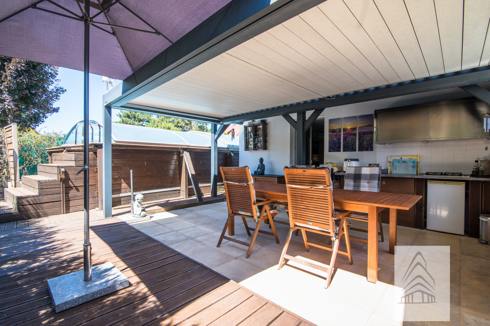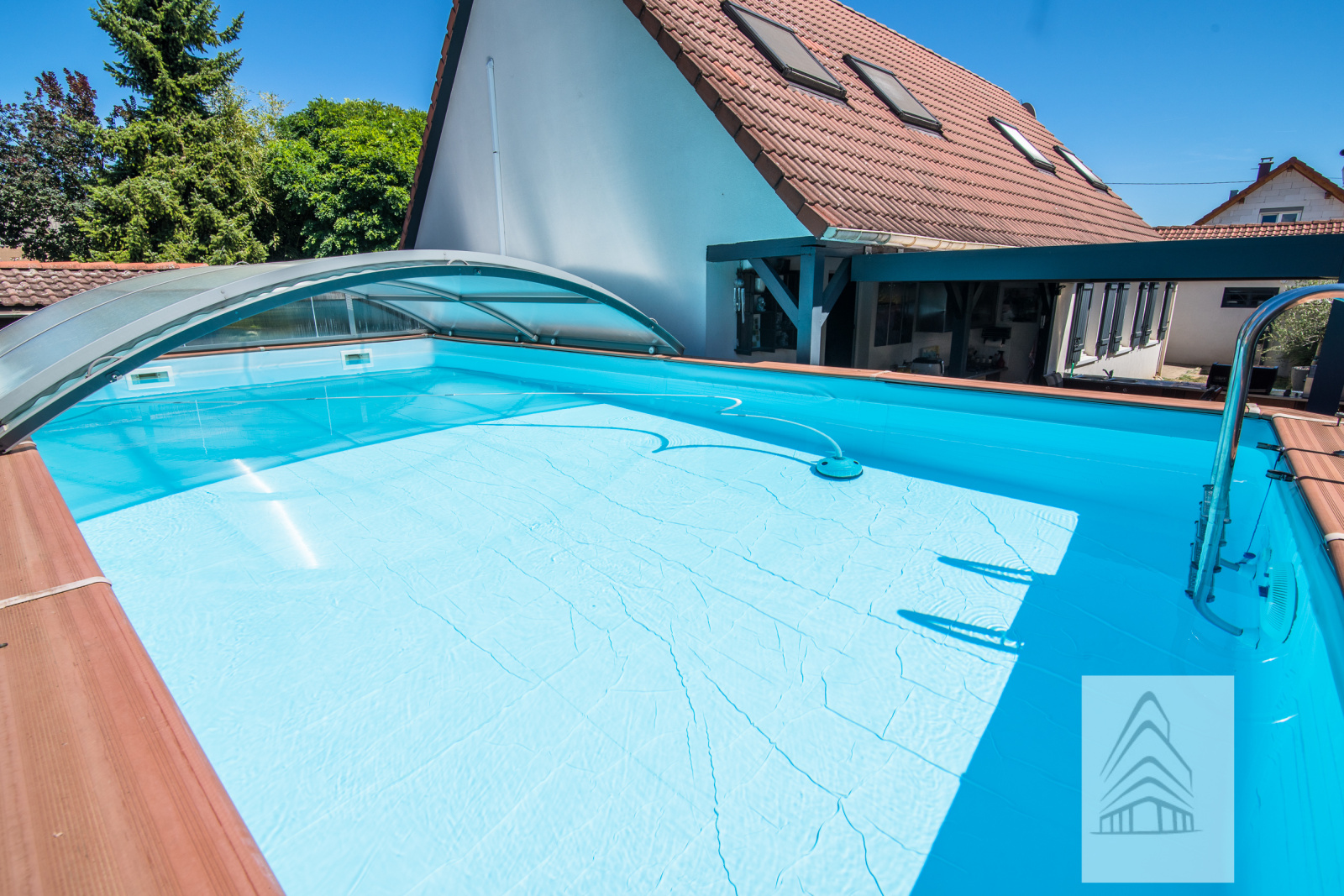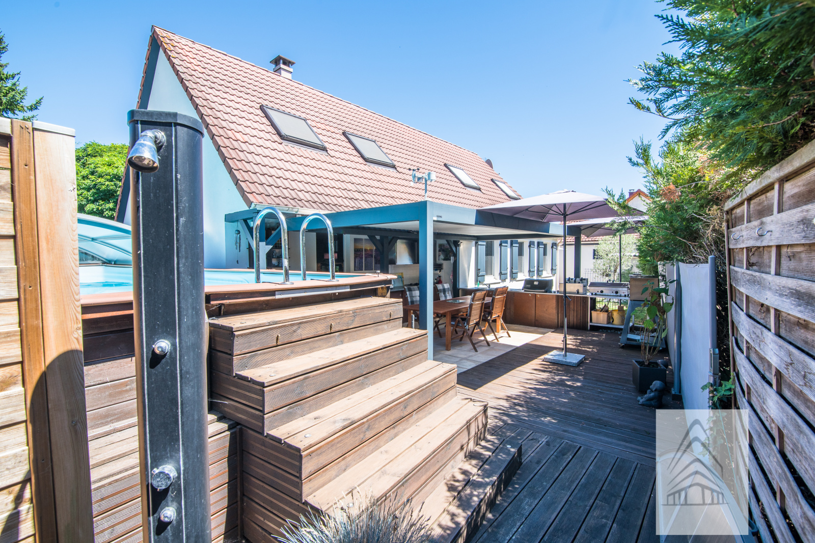 Belle propriété de 7 pièces de 142 m² habitables parfaitement entretenue, située au calme à KERTZFELD entre Strasbourg et Colmar, avec en complément 2 terrasses couvertes avec pergolas bioclimatiques, un double garage, une piscine hors sol de 8X4 couverte, un chalet en bois (local technique piscine), une cuisine d'été, un mini potager, sur un terrain clos et arboré.