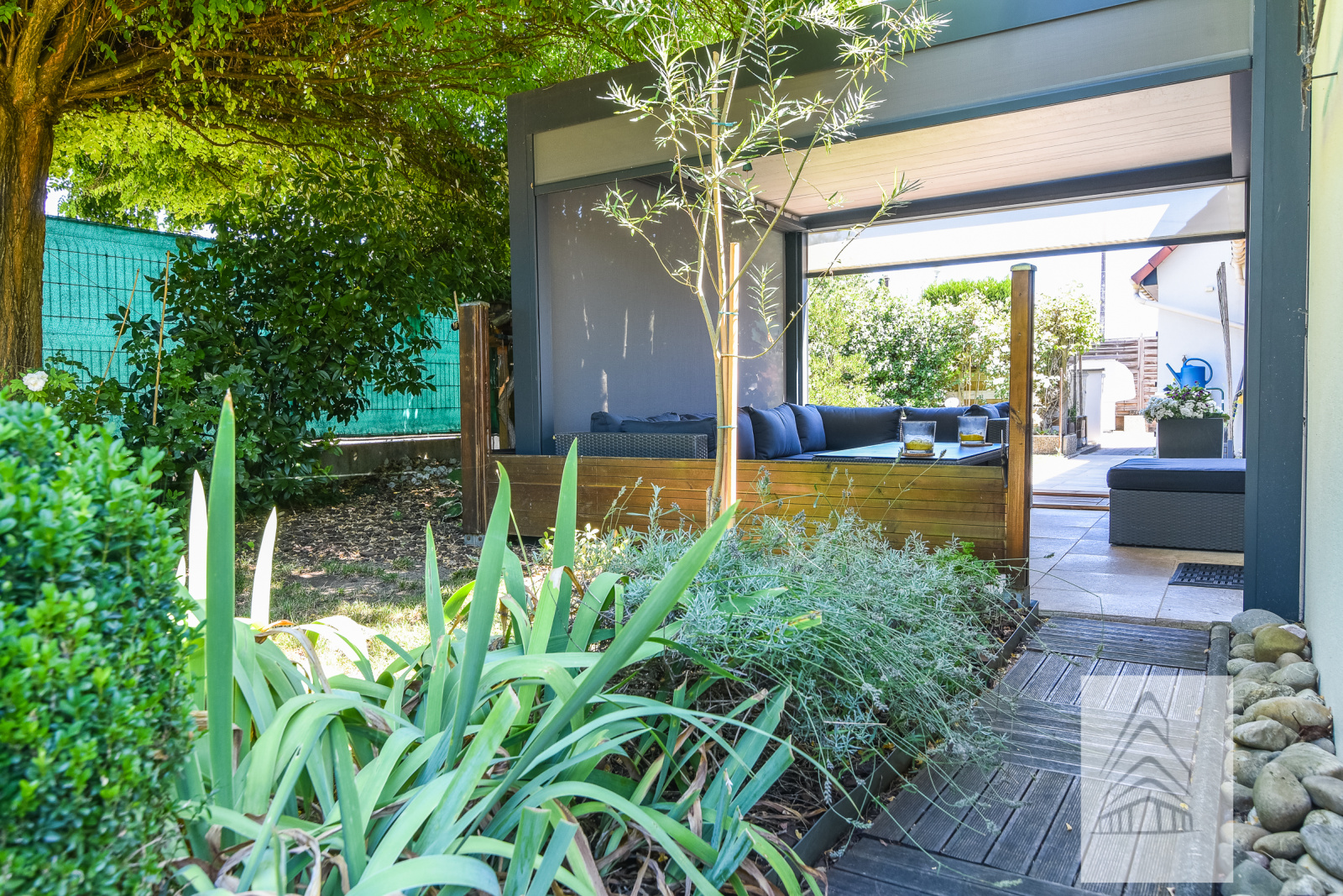 Elle est composée d'une entrée avec dégagement, une cuisine ouverte sur la pièce de vie de 40 m² avec accès aux deux terrasses, une chambre parentale de 17 m², une salle d'eau avec douche italienne, une pièce sauna, un espace bureau, une buanderie, à l'étage : une pièce de 25 m² avec espace bar, un WC, un bureau, une pièce de 10,35 m² au sol et une chambre.